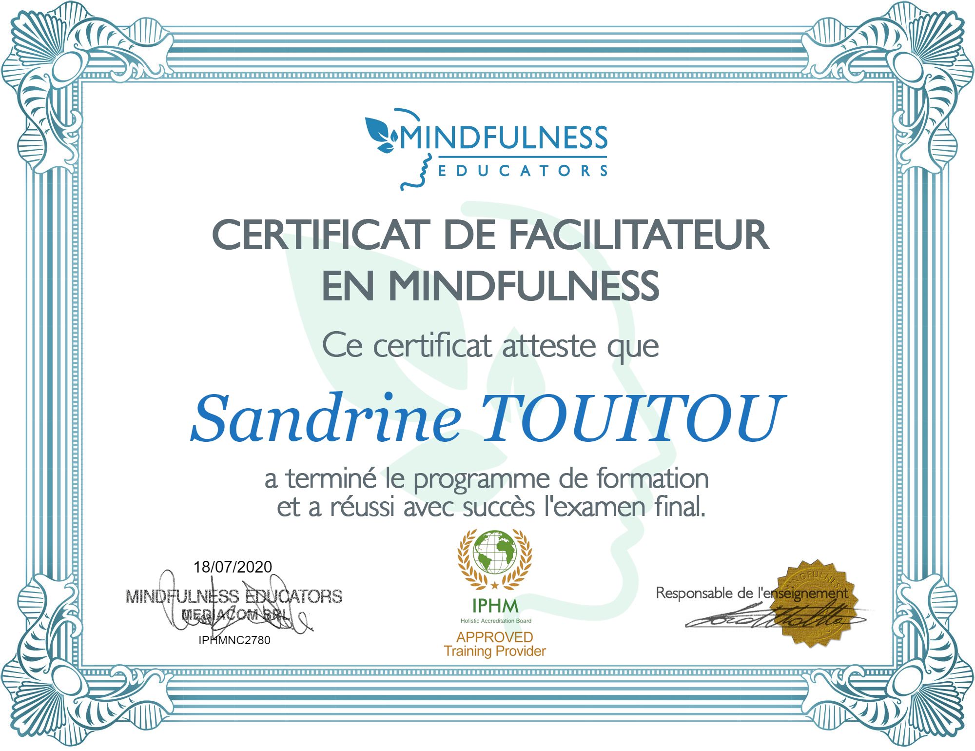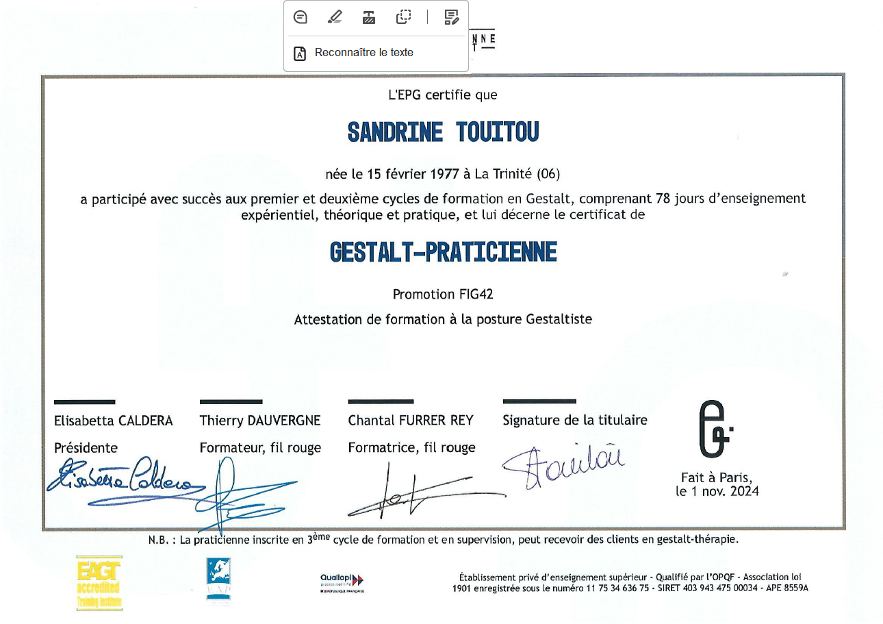 Et l’École Parisienne de Gestalt, qui m’a certifiée, est elle-même accréditée aux niveaux national et européen par :